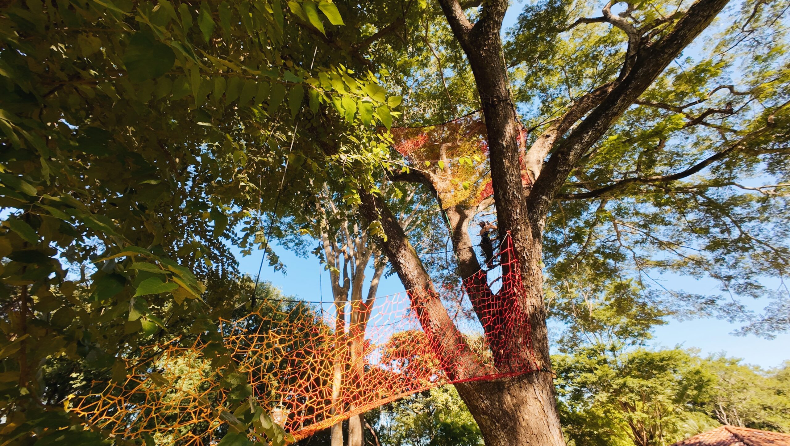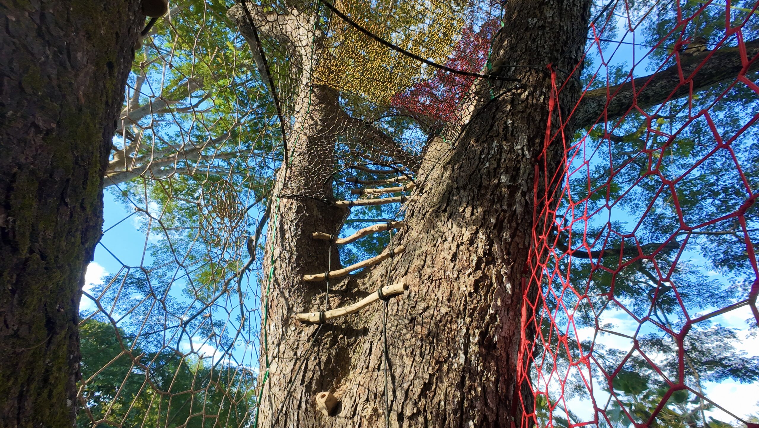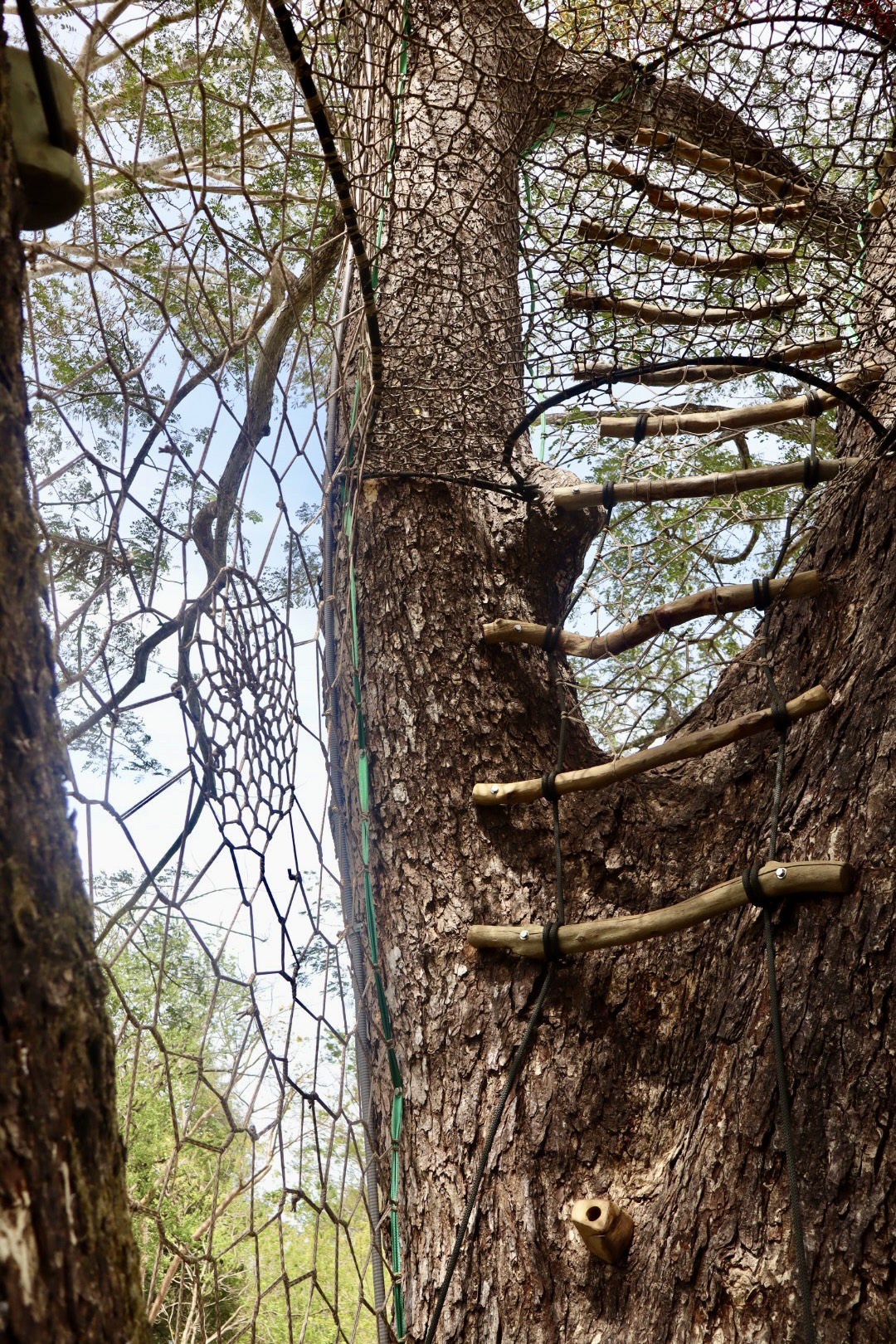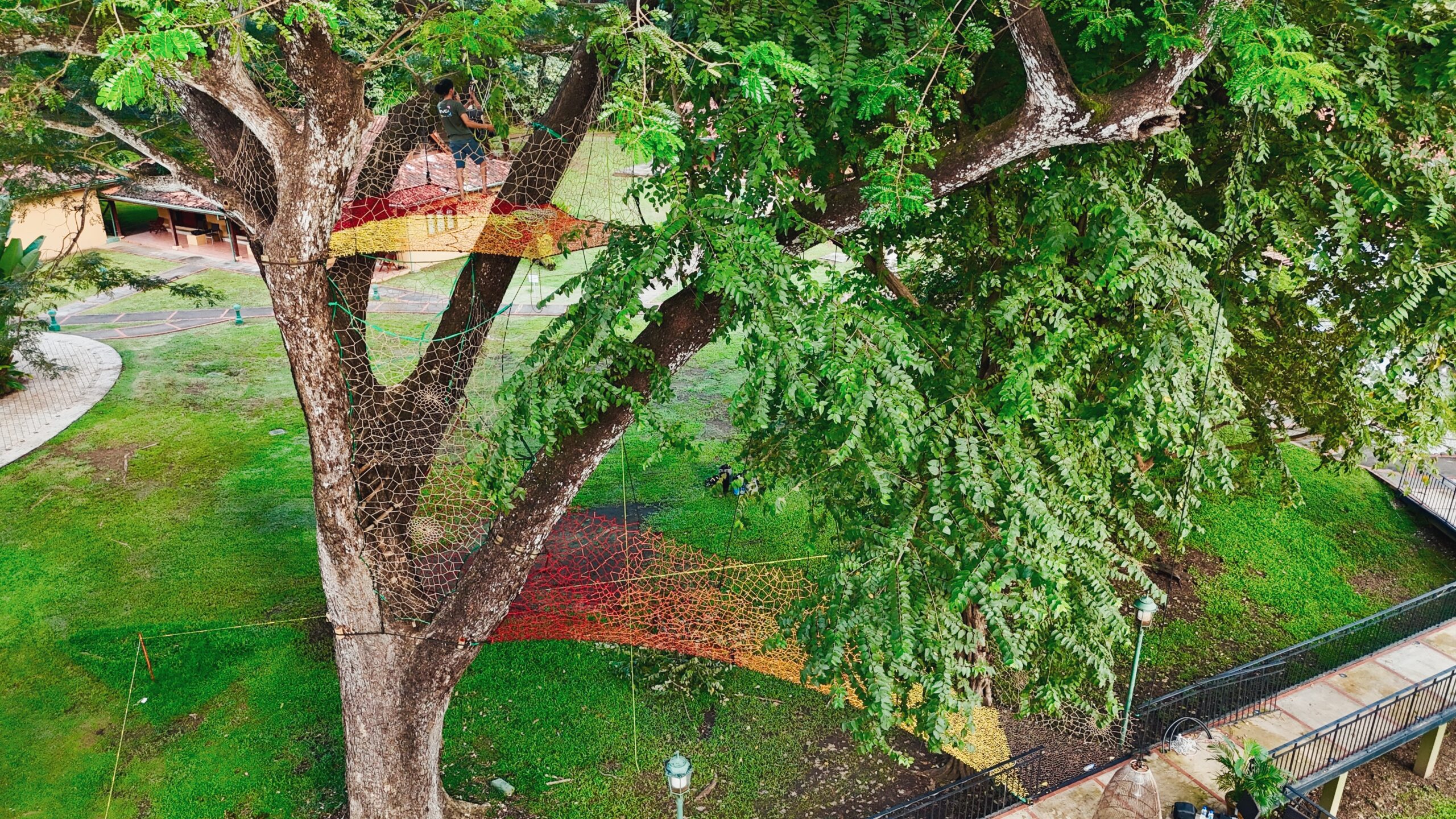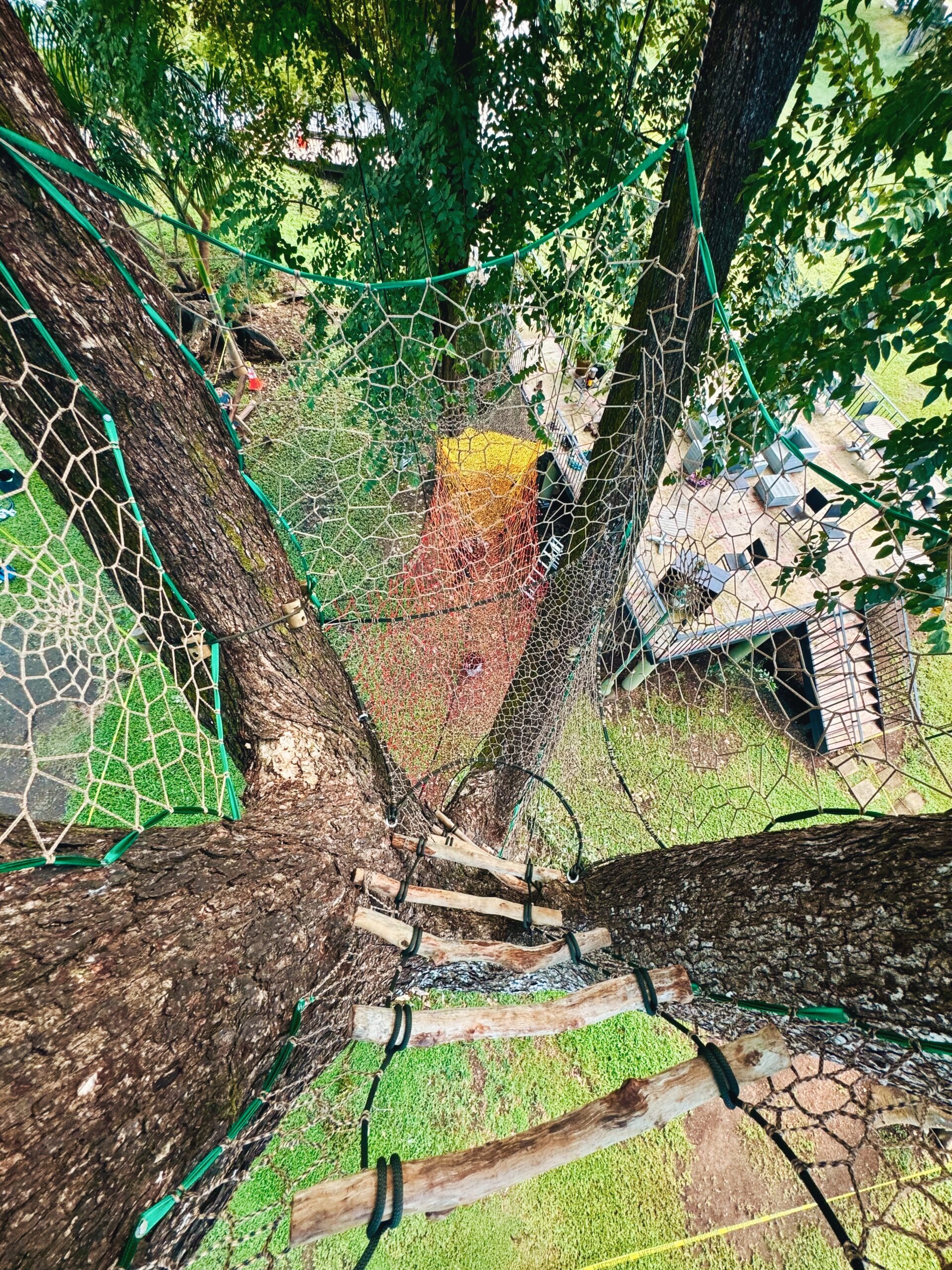 A magical Treenet over 15 meters high in a century-old Cenizaro tree, starting with a gradient ramp leading to this magical being, climbing up an organic, woven ladder to experience an incredible connection with this massive tree, all the way up to its canopy to share and relax.