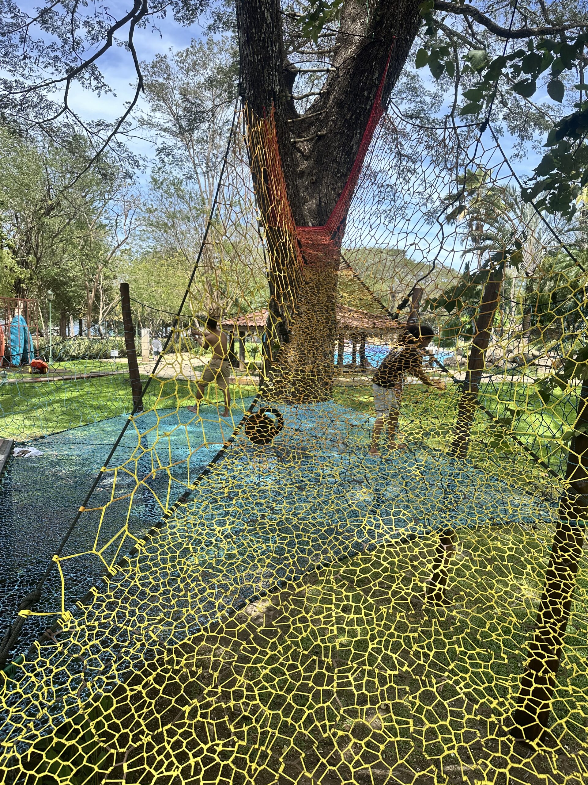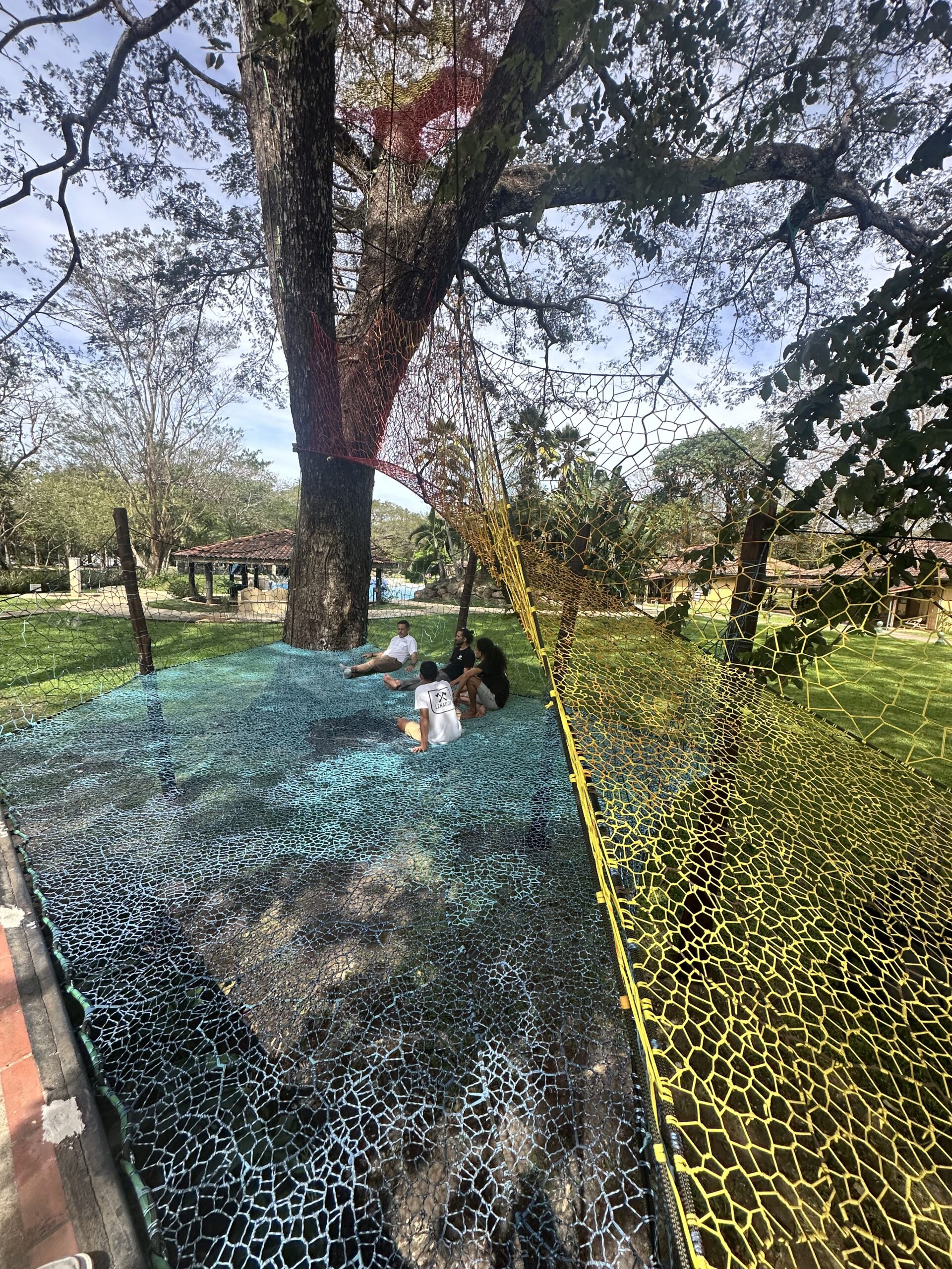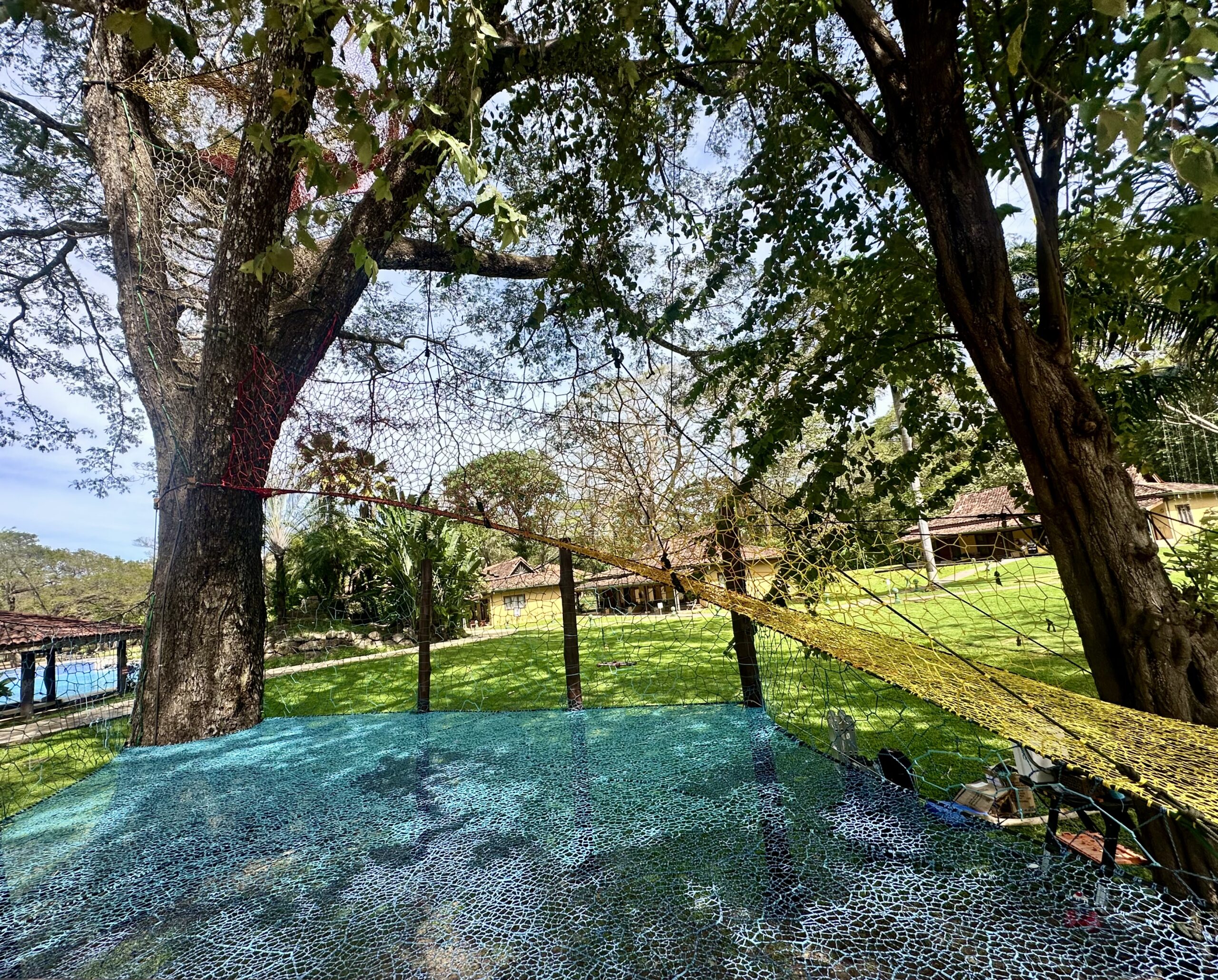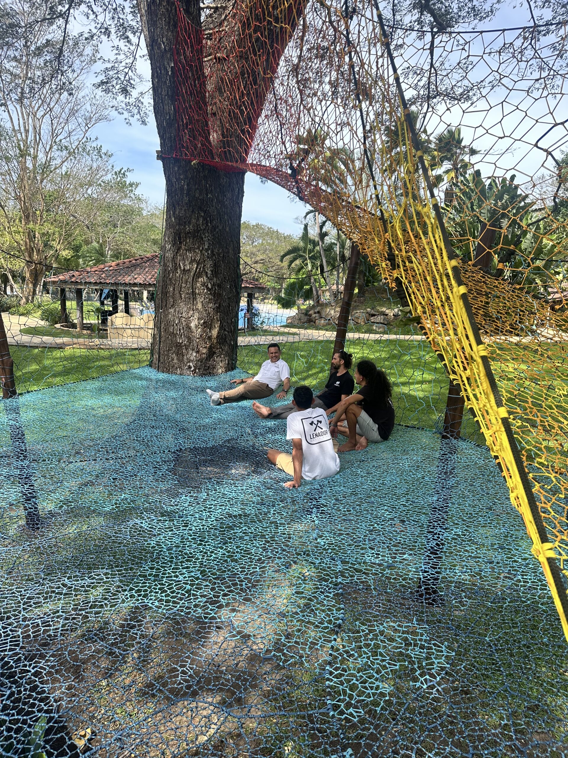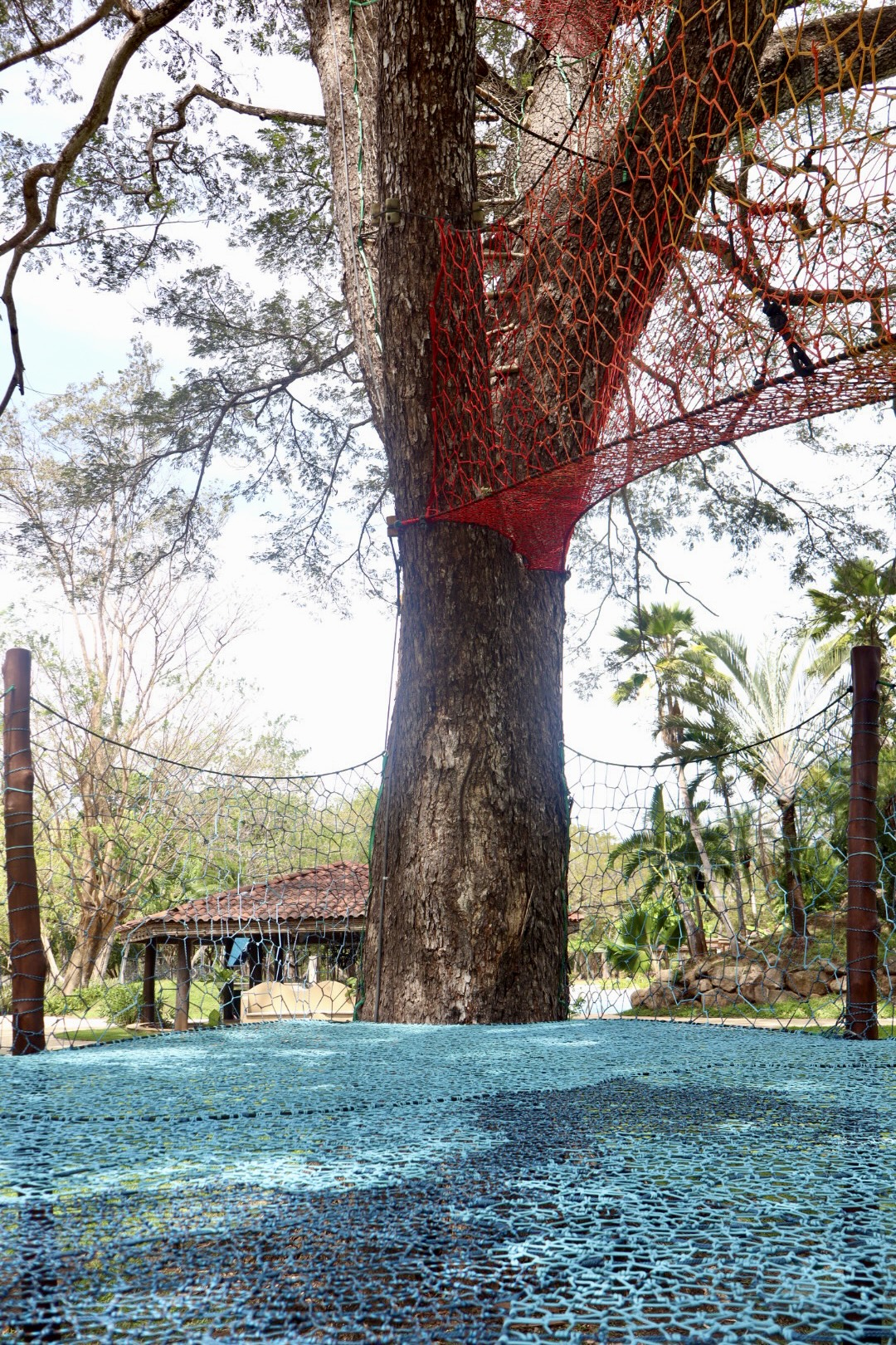 A magical Treenet over 15 meters high in a century-old Cenizaro tree, starting with a gradient ramp leading to this magical being, climbing up an organic, woven ladder to experience an incredible connection with this massive tree, all the way up to its canopy to share and relax.