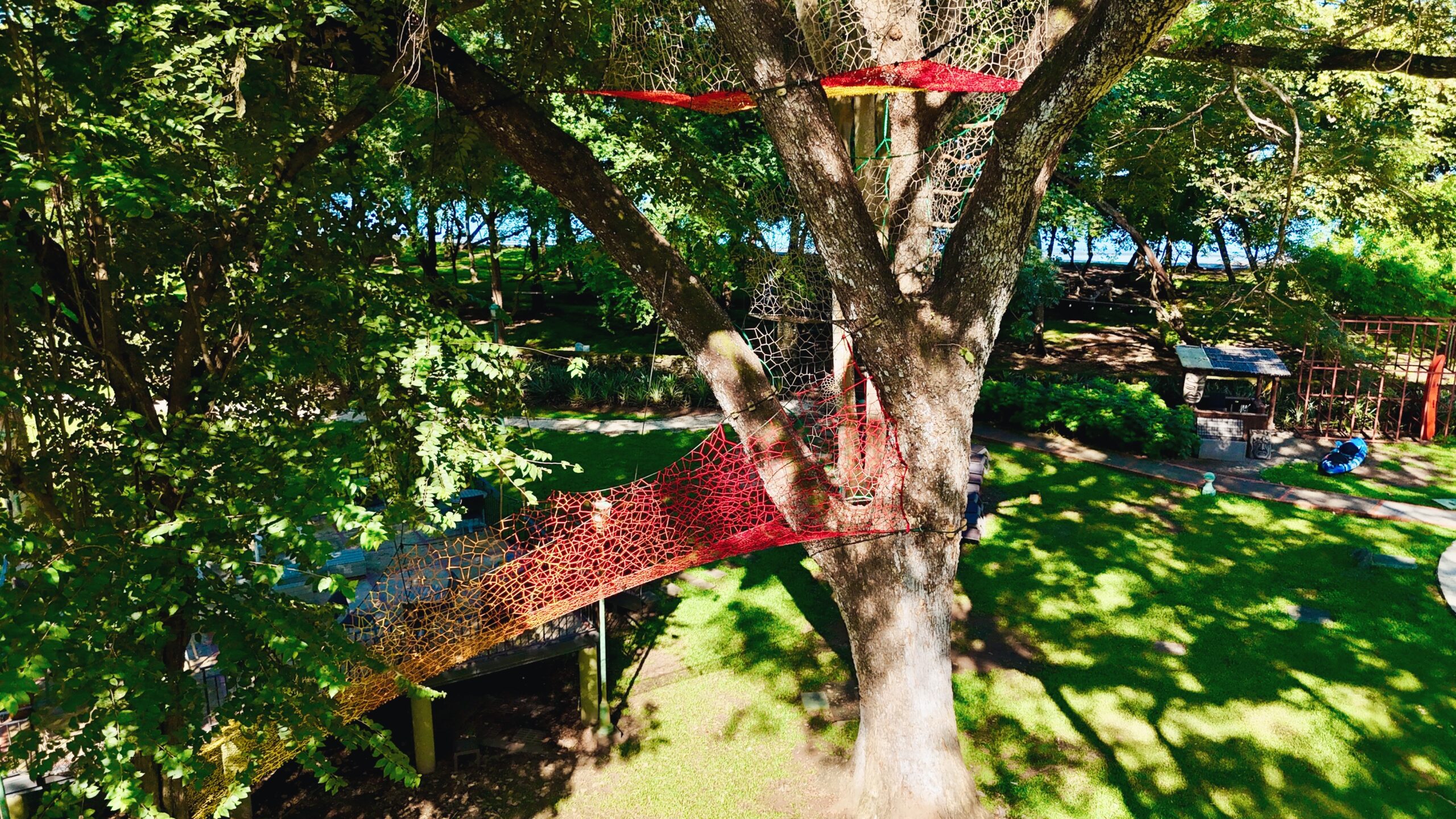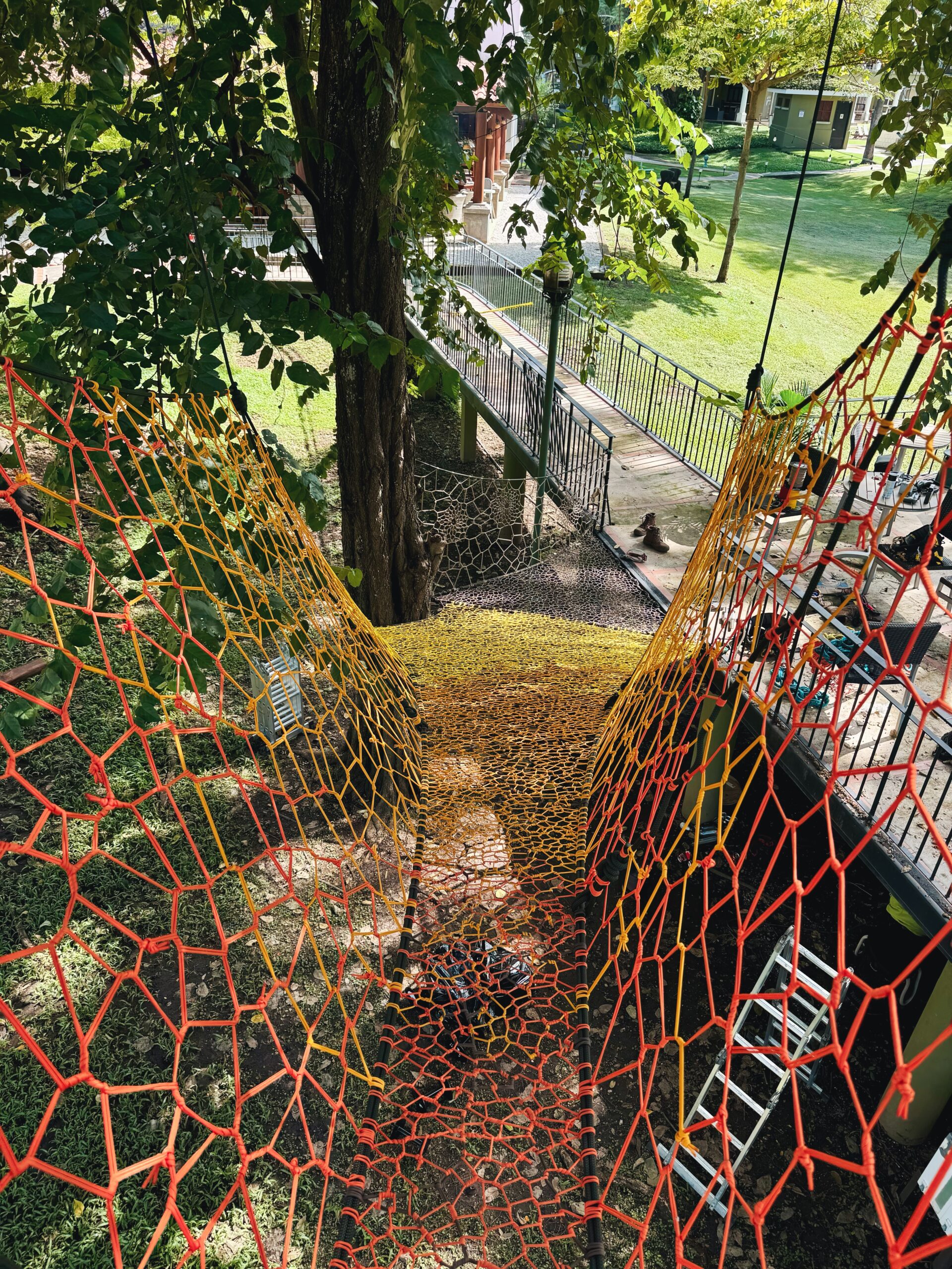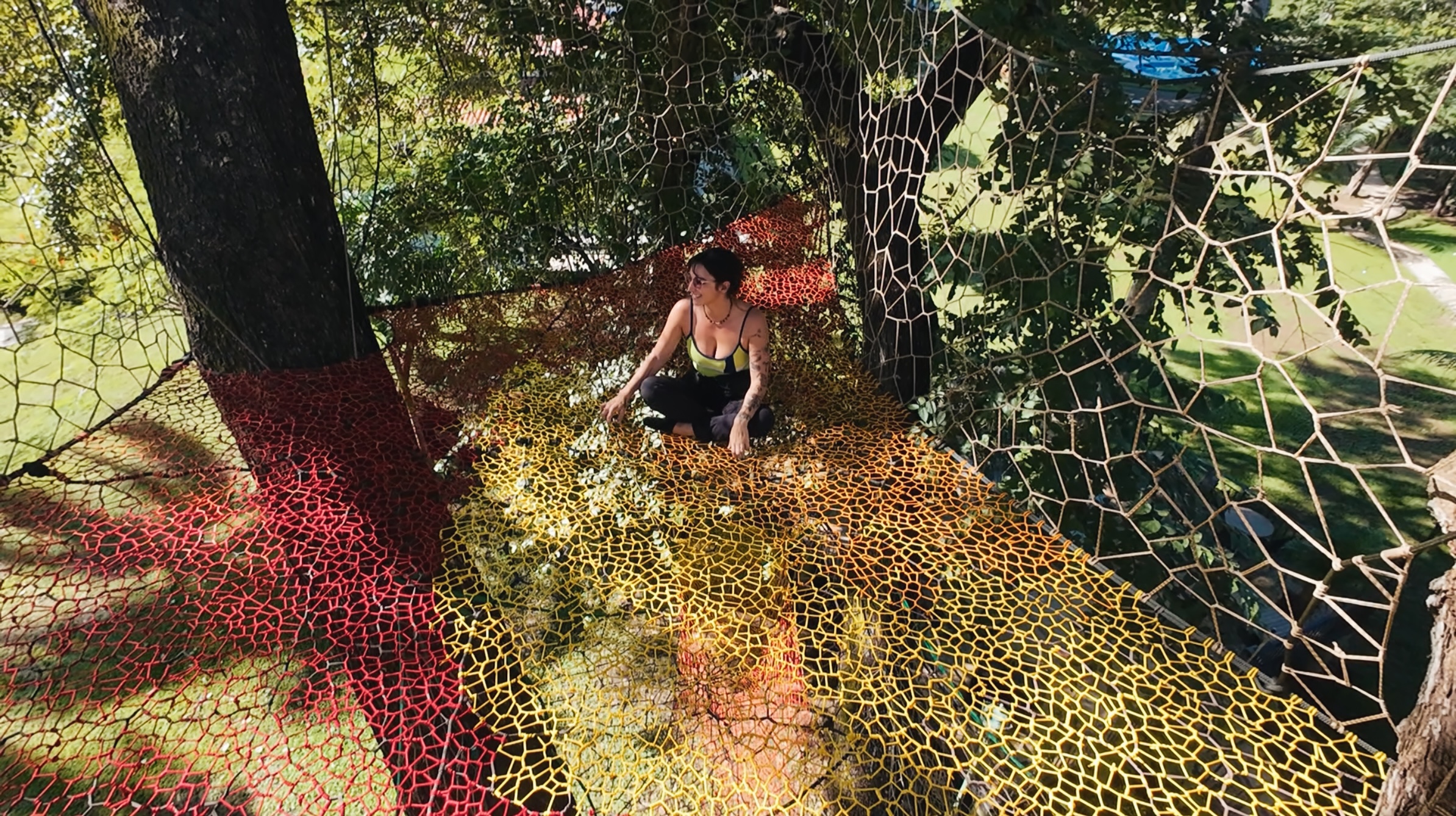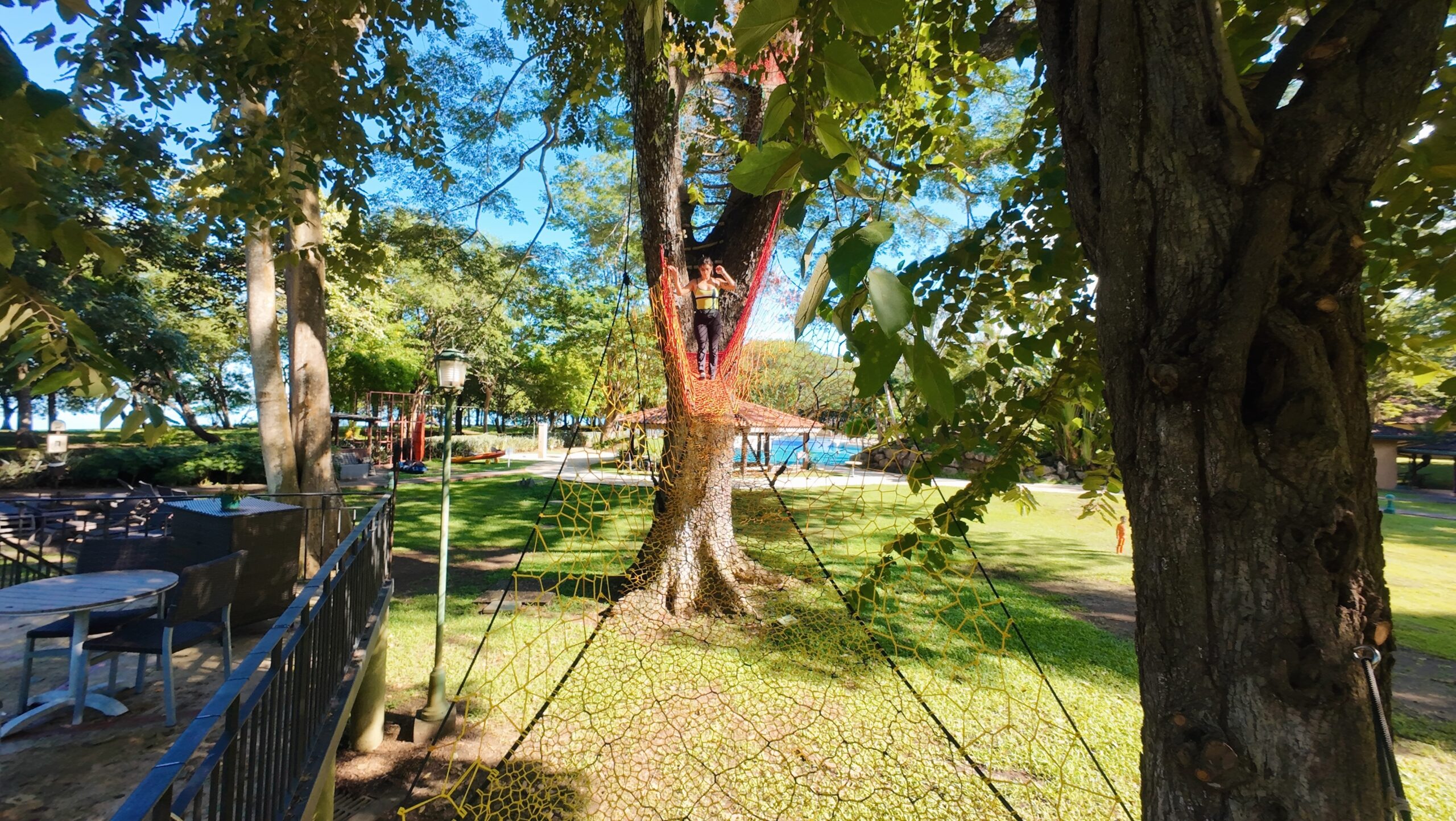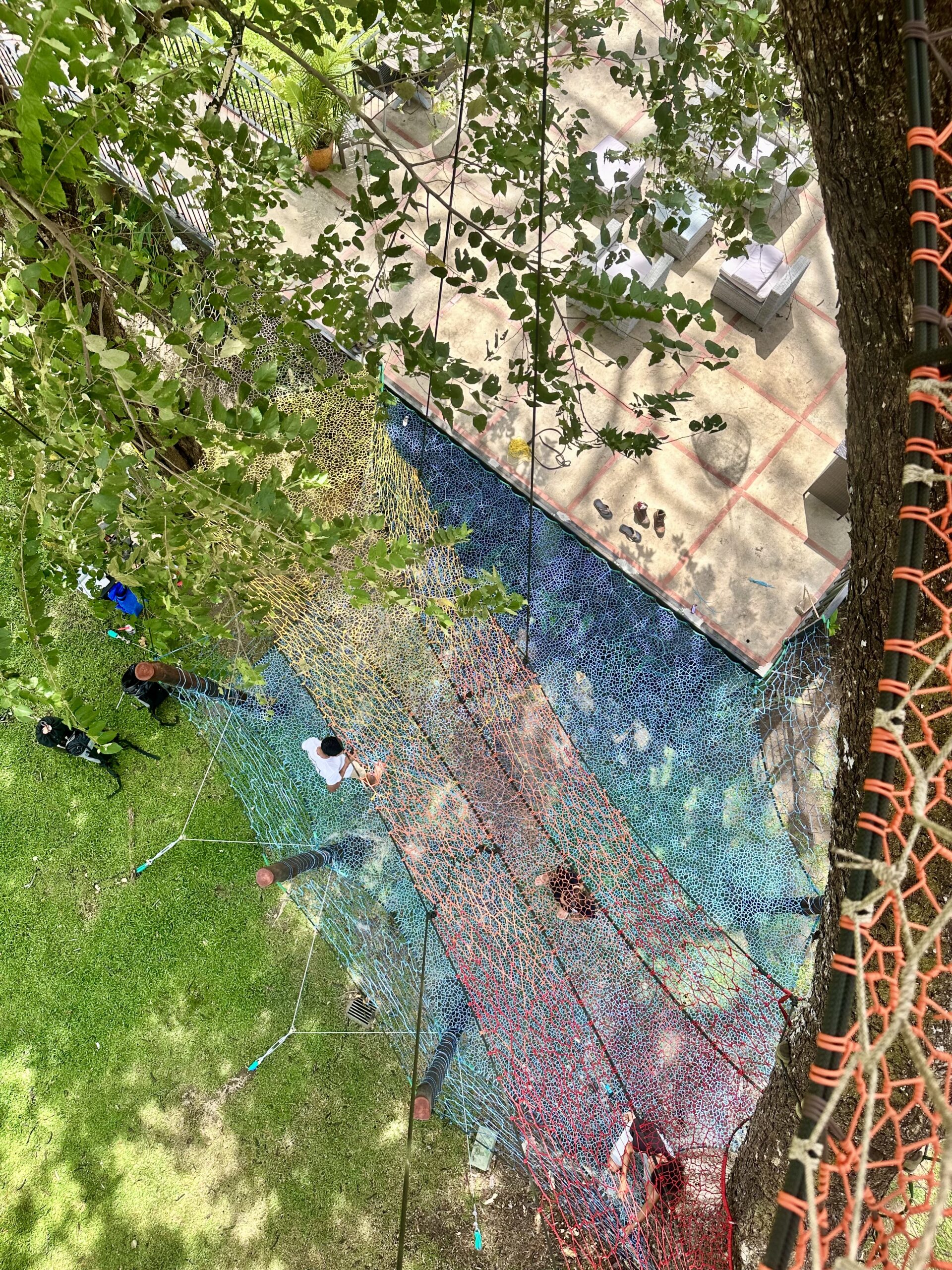 A magical Treenet over 15 meters high in a century-old Cenizaro tree, starting with a gradient ramp leading to this magical being, climbing up an organic, woven ladder to experience an incredible connection with this massive tree, all the way up to its canopy to share and relax.