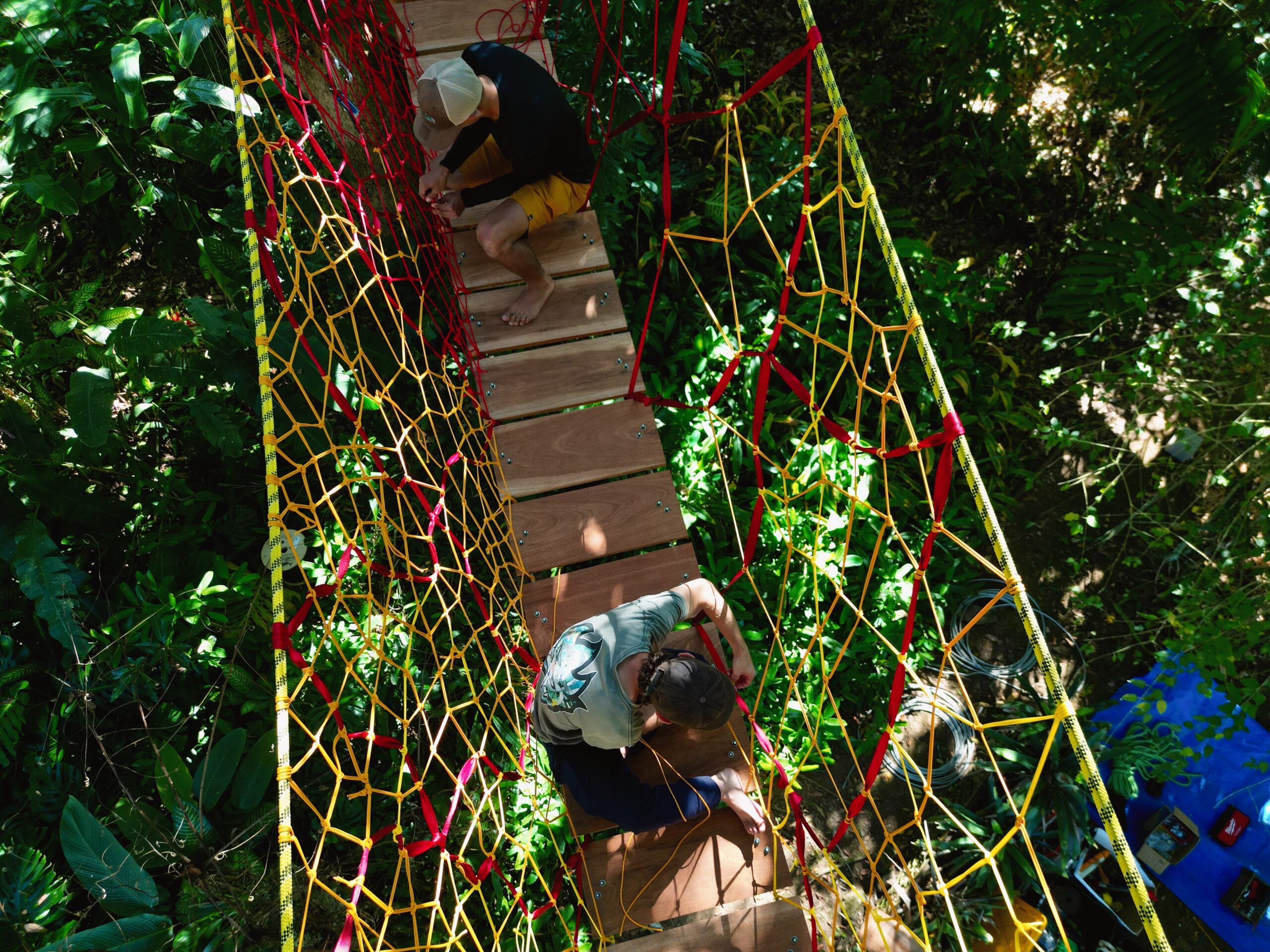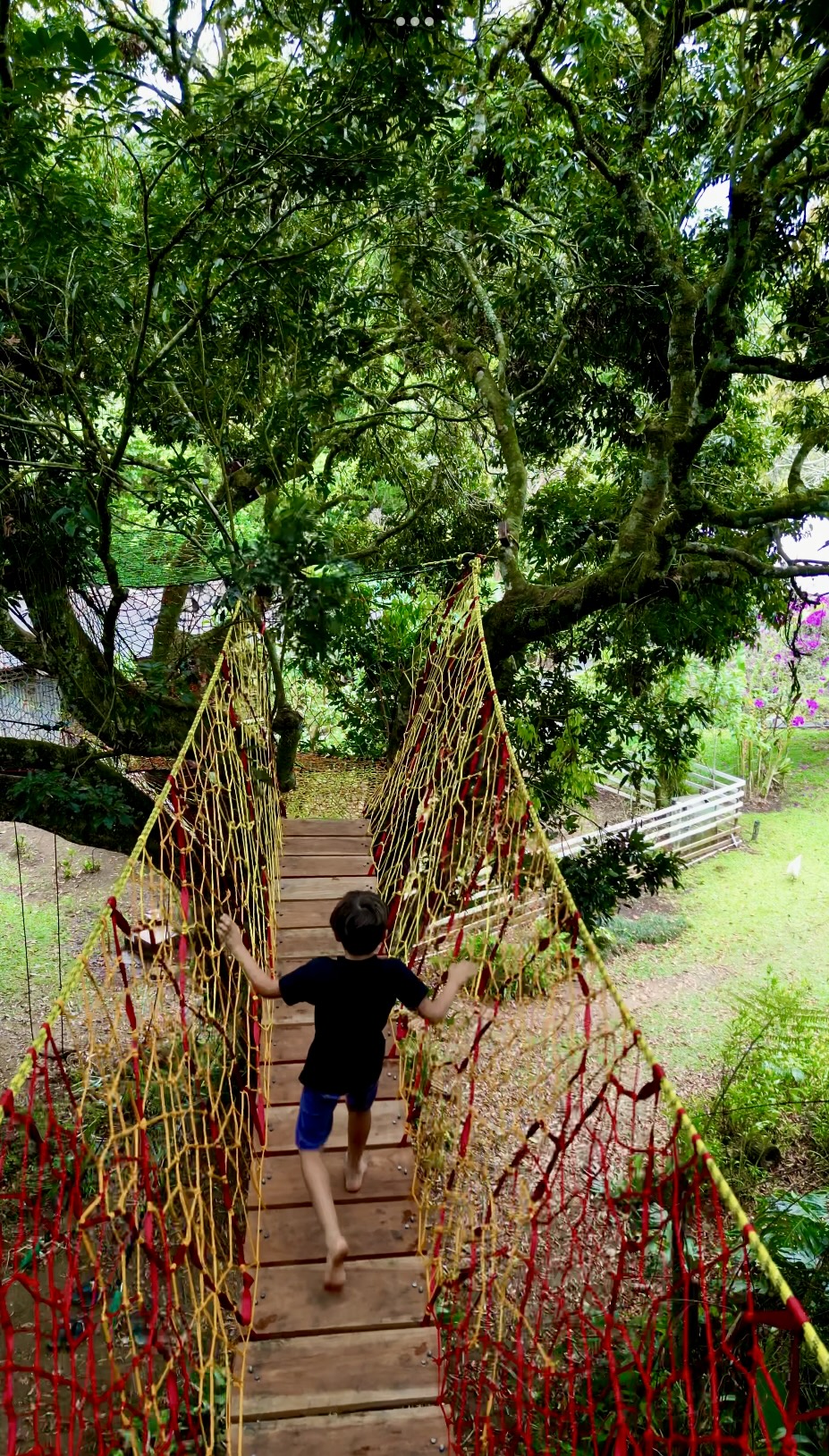 A very different children’s play area, with the possibility for the little ones to climb and tour the canopy of not only one but two trees, connected between them with a very colorful suspension bridge.