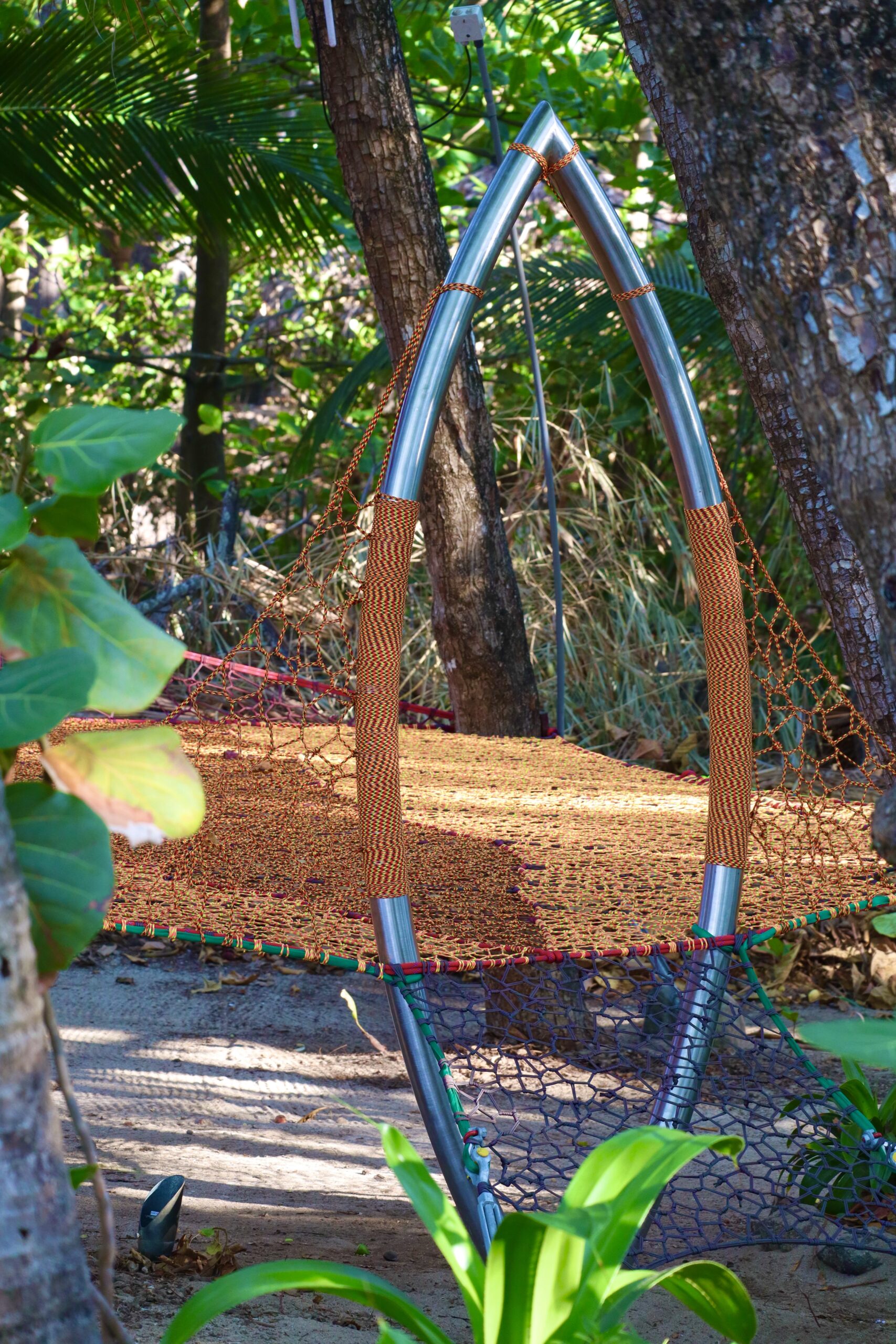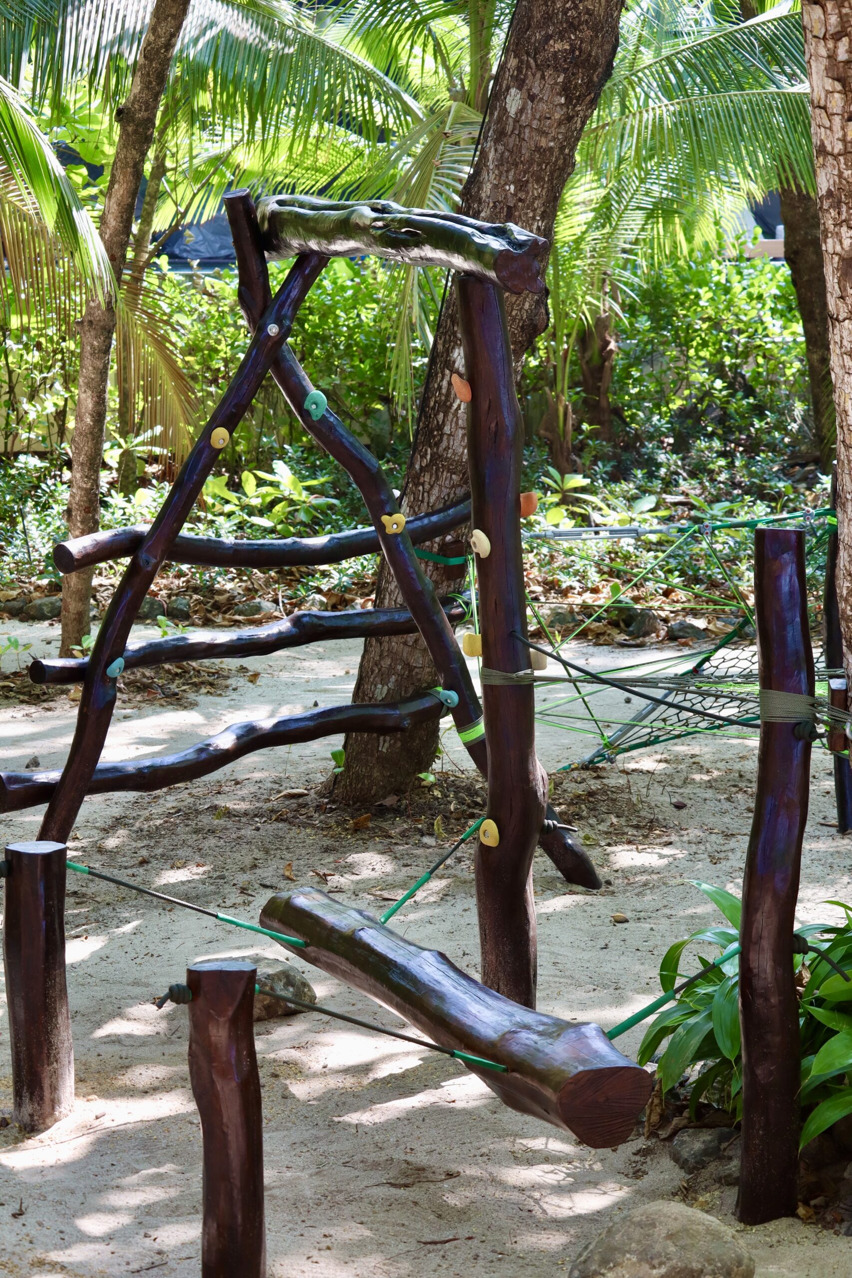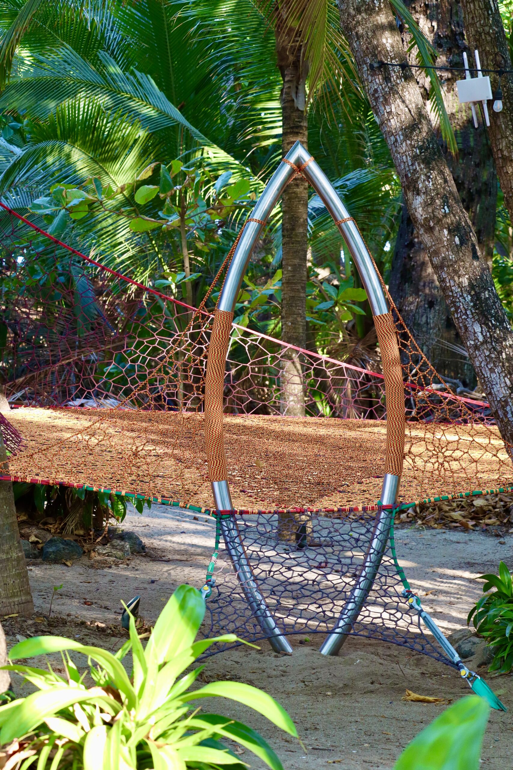 The second structure, designed for adults, features a large Treenet suspended above the ground. It offers a privileged view — an ideal space to rest after a swim in the ocean, reconnection and watch the children play.