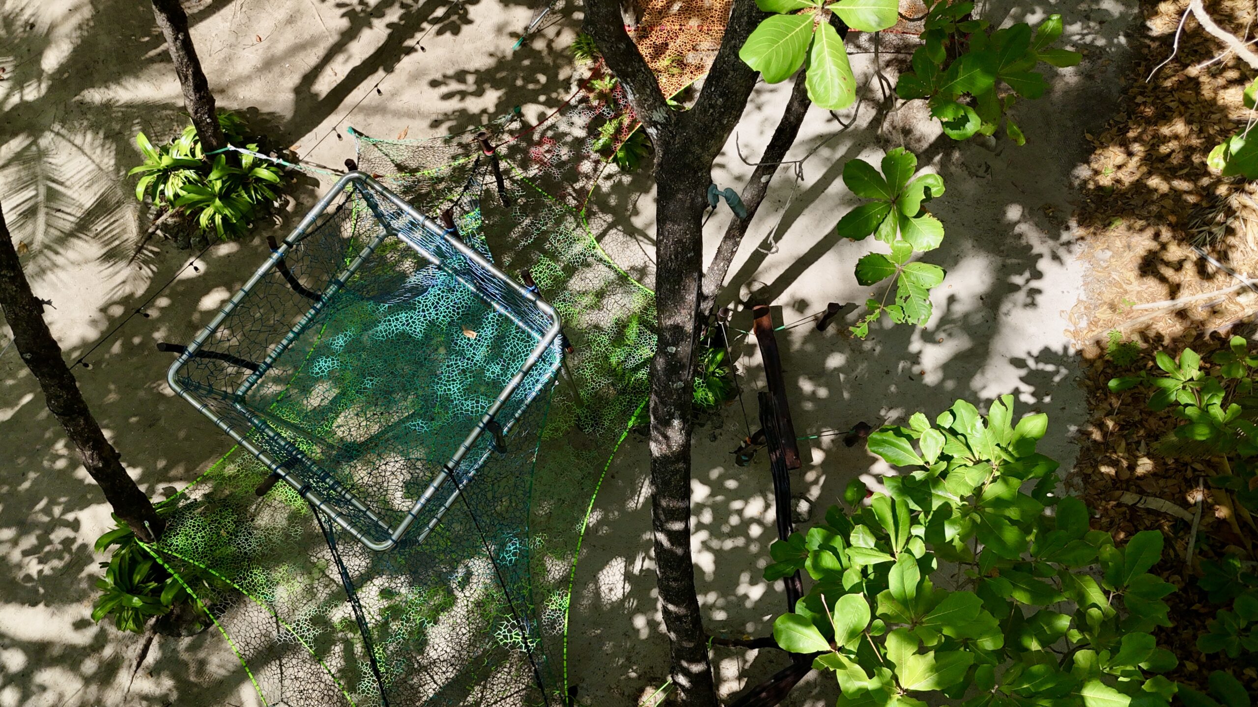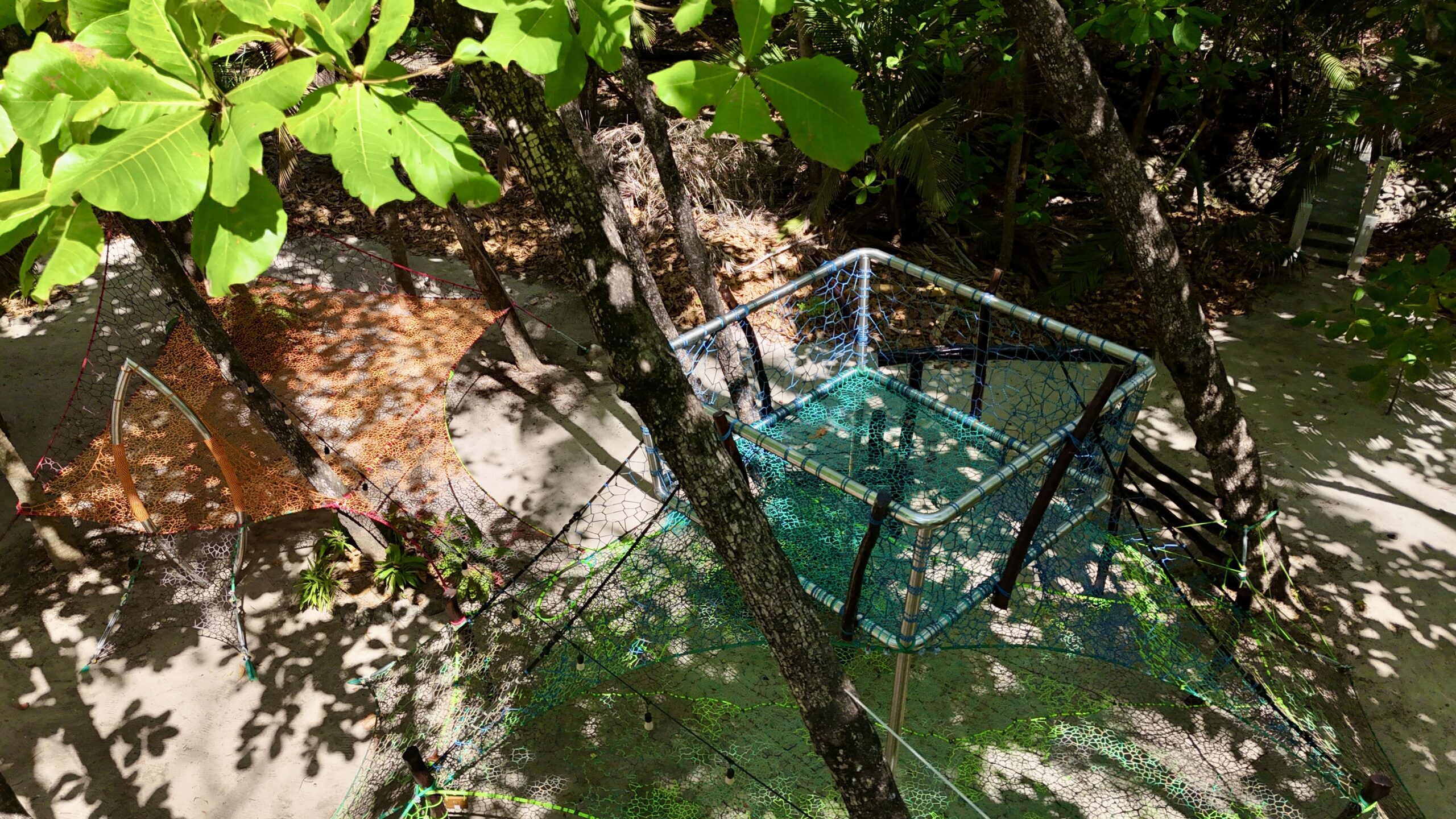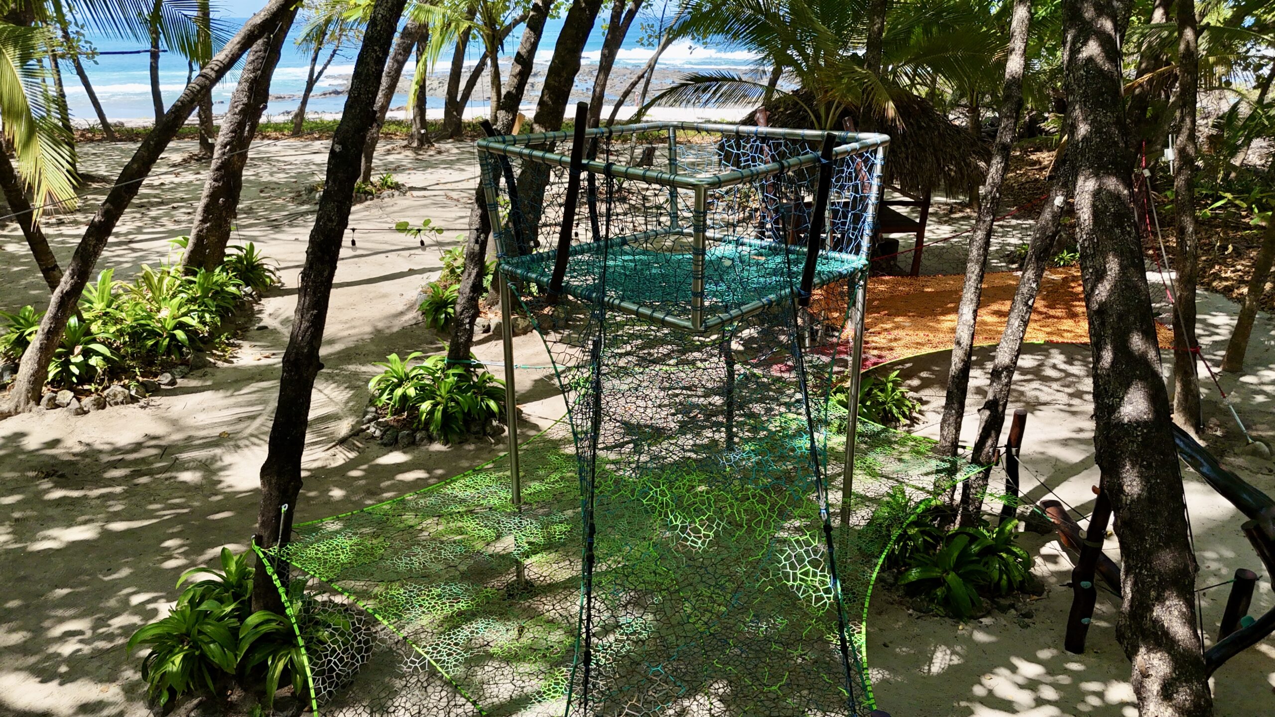 The second structure, designed for adults, features a large Treenet suspended above the ground. It offers a privileged view — an ideal space to rest after a swim in the ocean, reconnection and watch the children play.