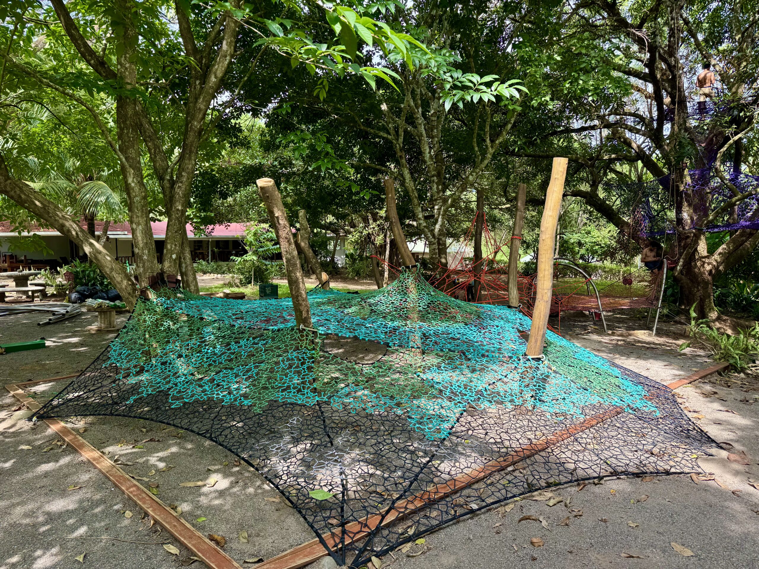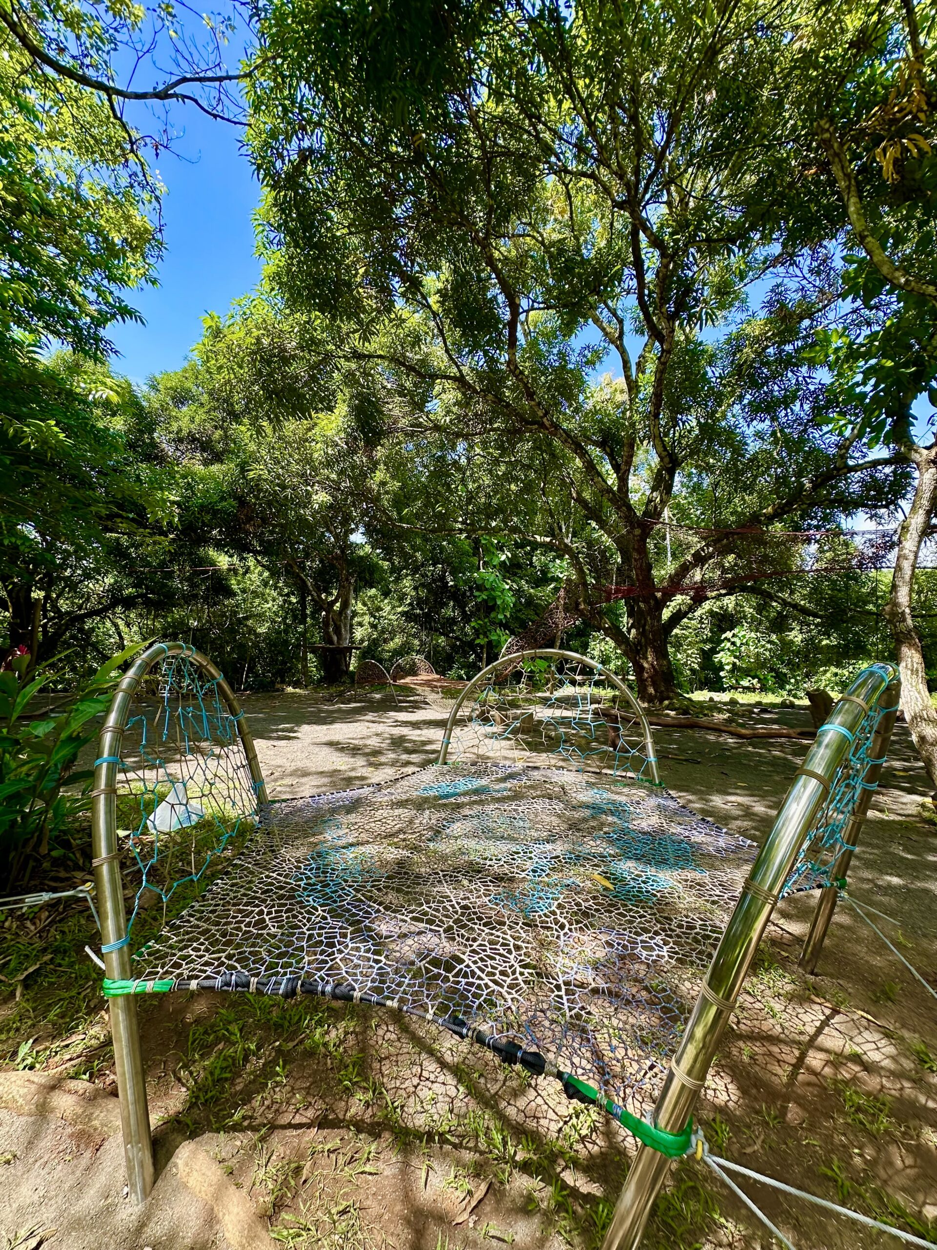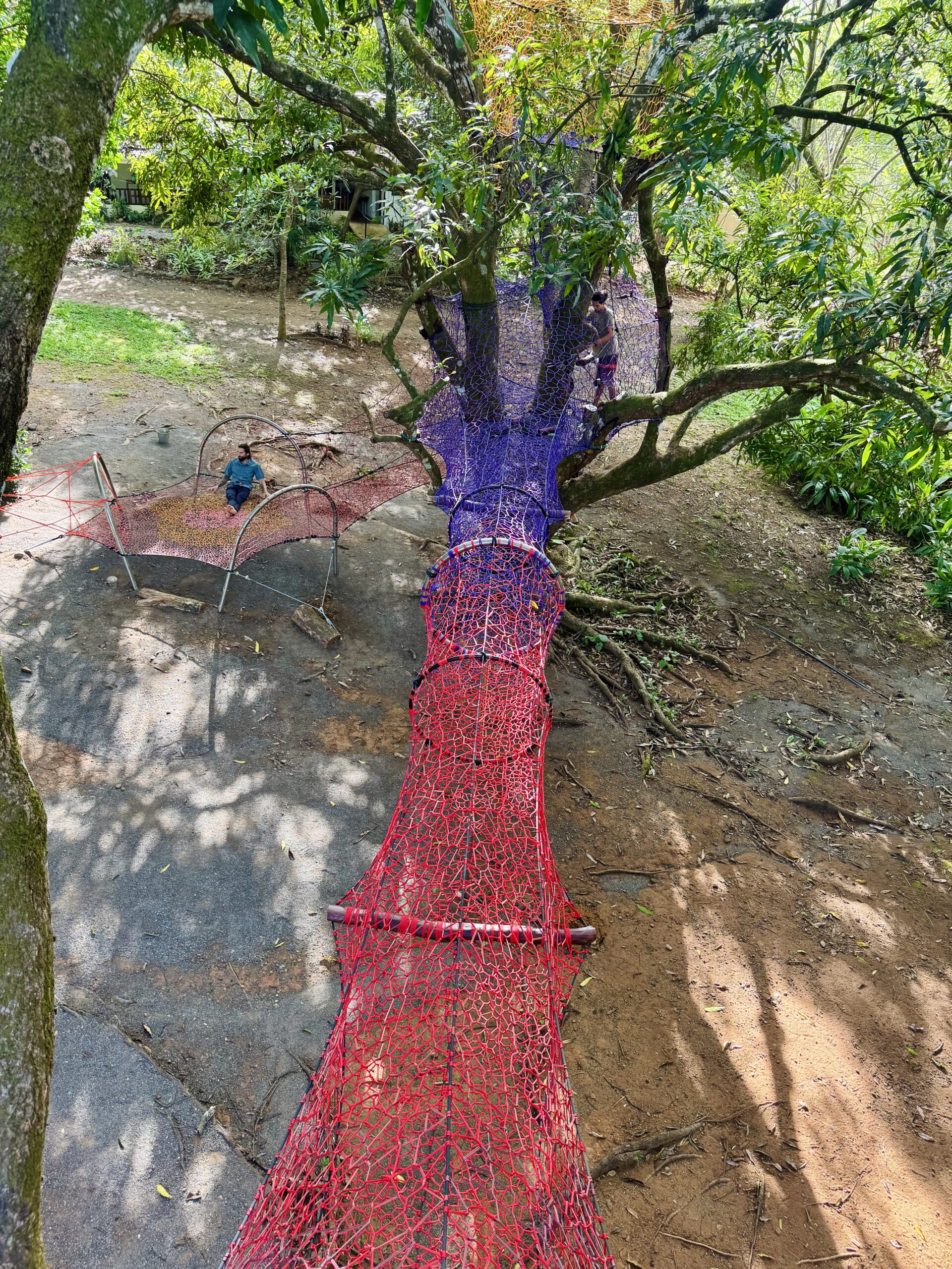 As the second phase of a beautiful project already completed in the same area, we added extra trampolines, a monkey bar with a slide, and a woven cylindrical bridge connecting two mango trees. This leads to multi-level nets nestled in the treetops, ending in a woven slide that lands on a trampoline. We also created a fun ‘Bouncy Hills’ area and a rope pyramid.