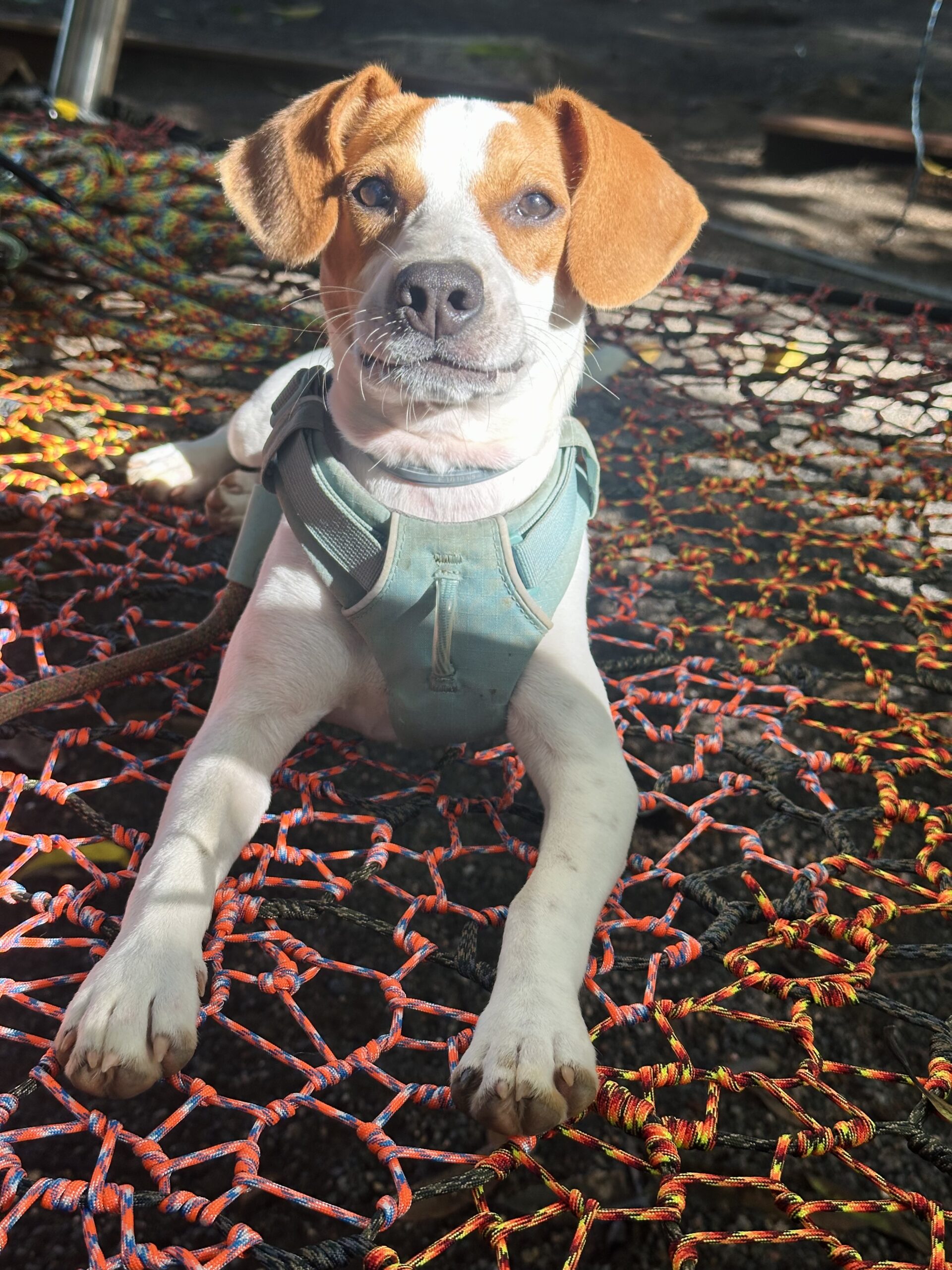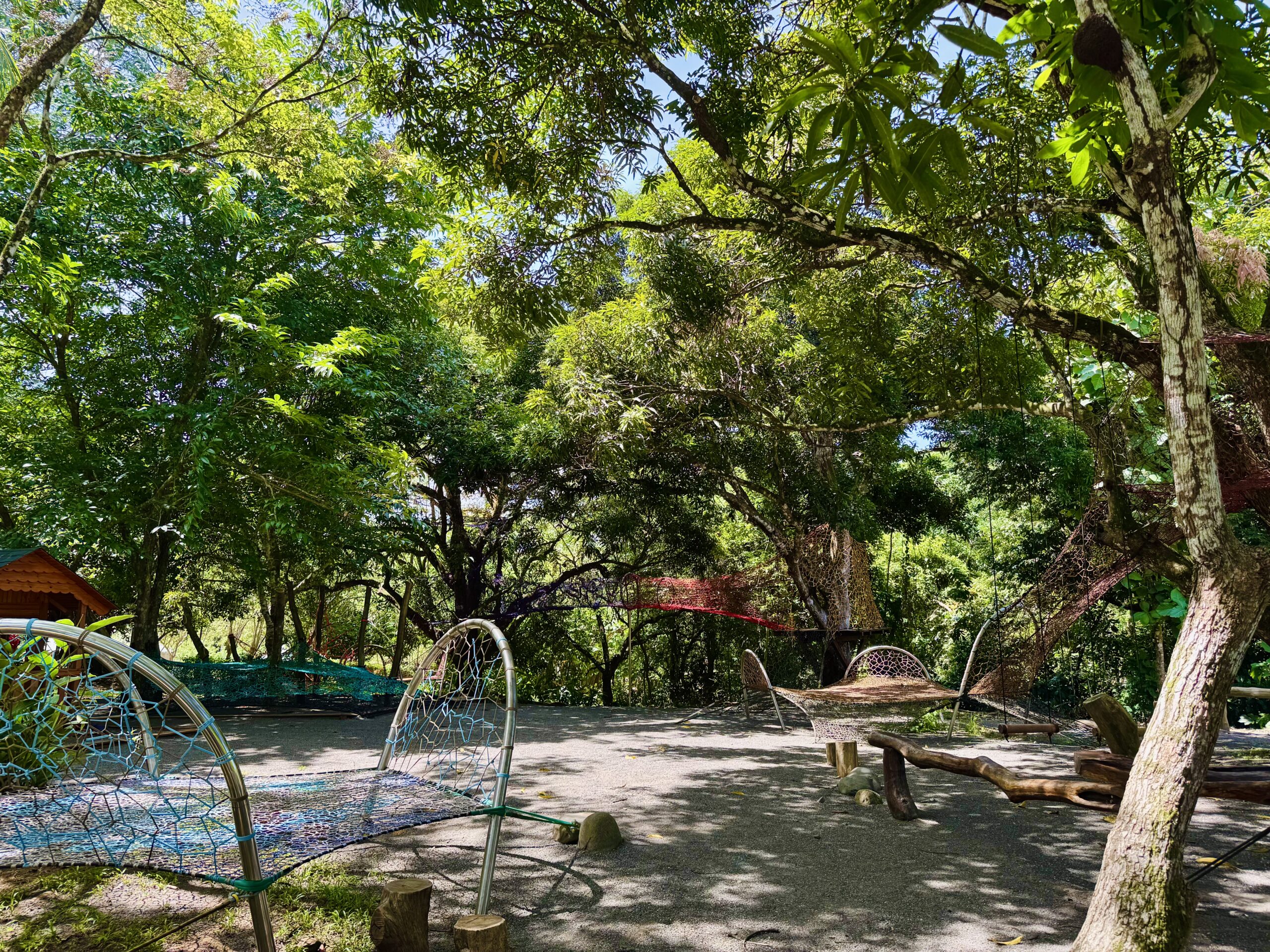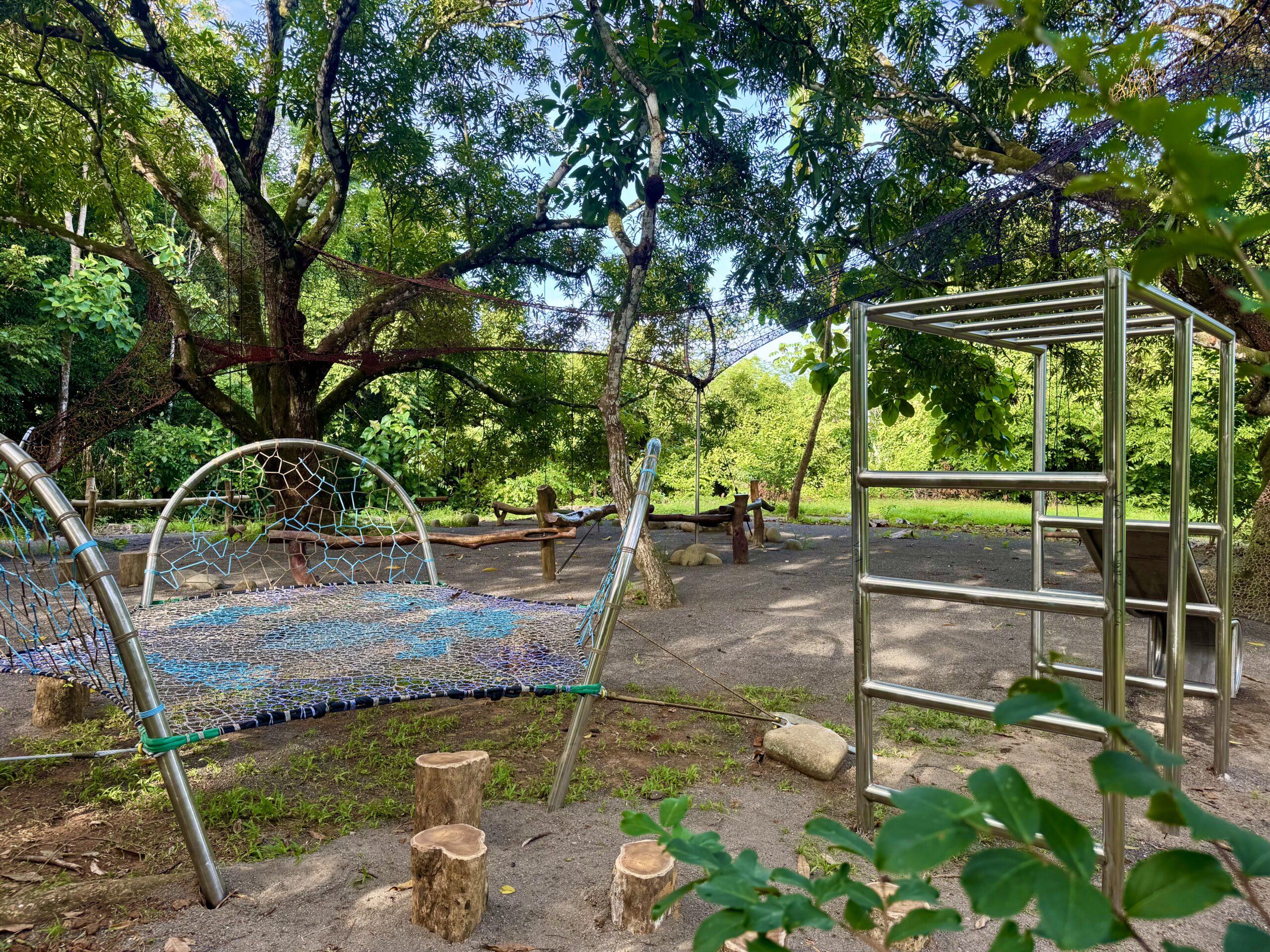 As the second phase of a beautiful project already completed in the same area, we added extra trampolines, a monkey bar with a slide, and a woven cylindrical bridge connecting two mango trees. This leads to multi-level nets nestled in the treetops, ending in a woven slide that lands on a trampoline. We also created a fun ‘Bouncy Hills’ area and a rope pyramid.