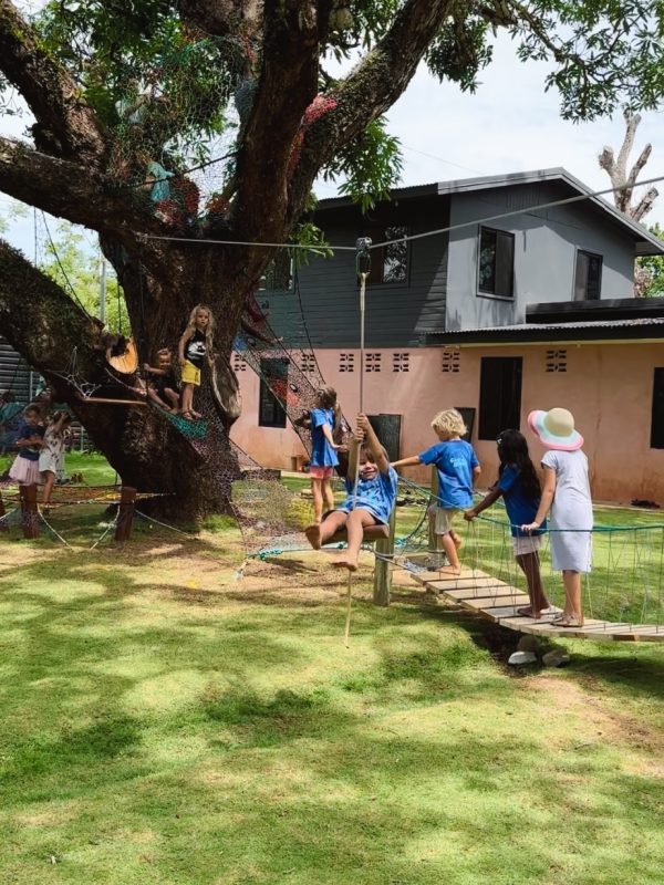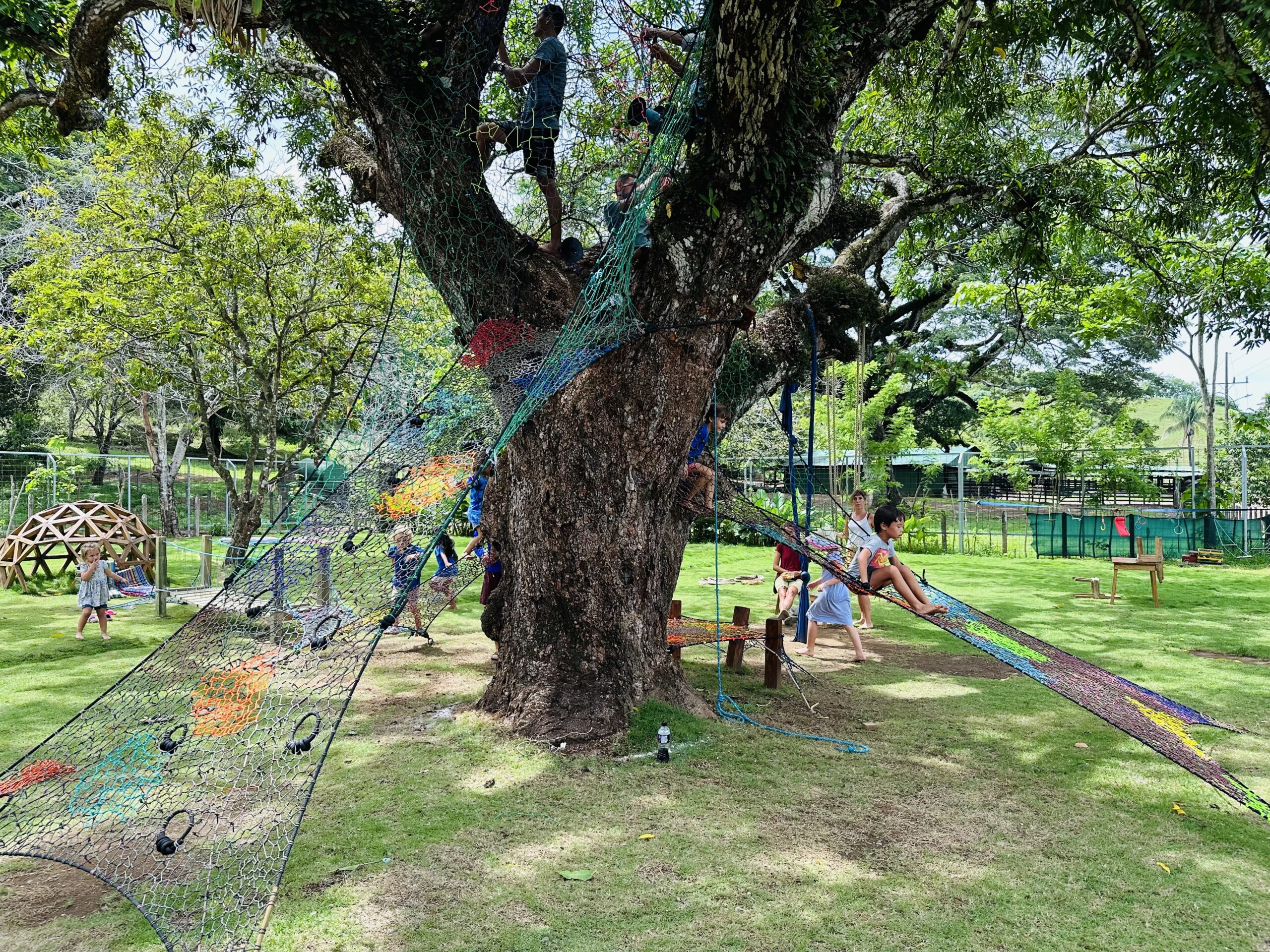 A fun set of three woven ramps that give access to a very old mango tree with a small woven nest 6 meters high to give safe access to the most adventurous kiddos, a woven trampoline-type platform and a beautiful suspension bridge that connects with a wooden dome.