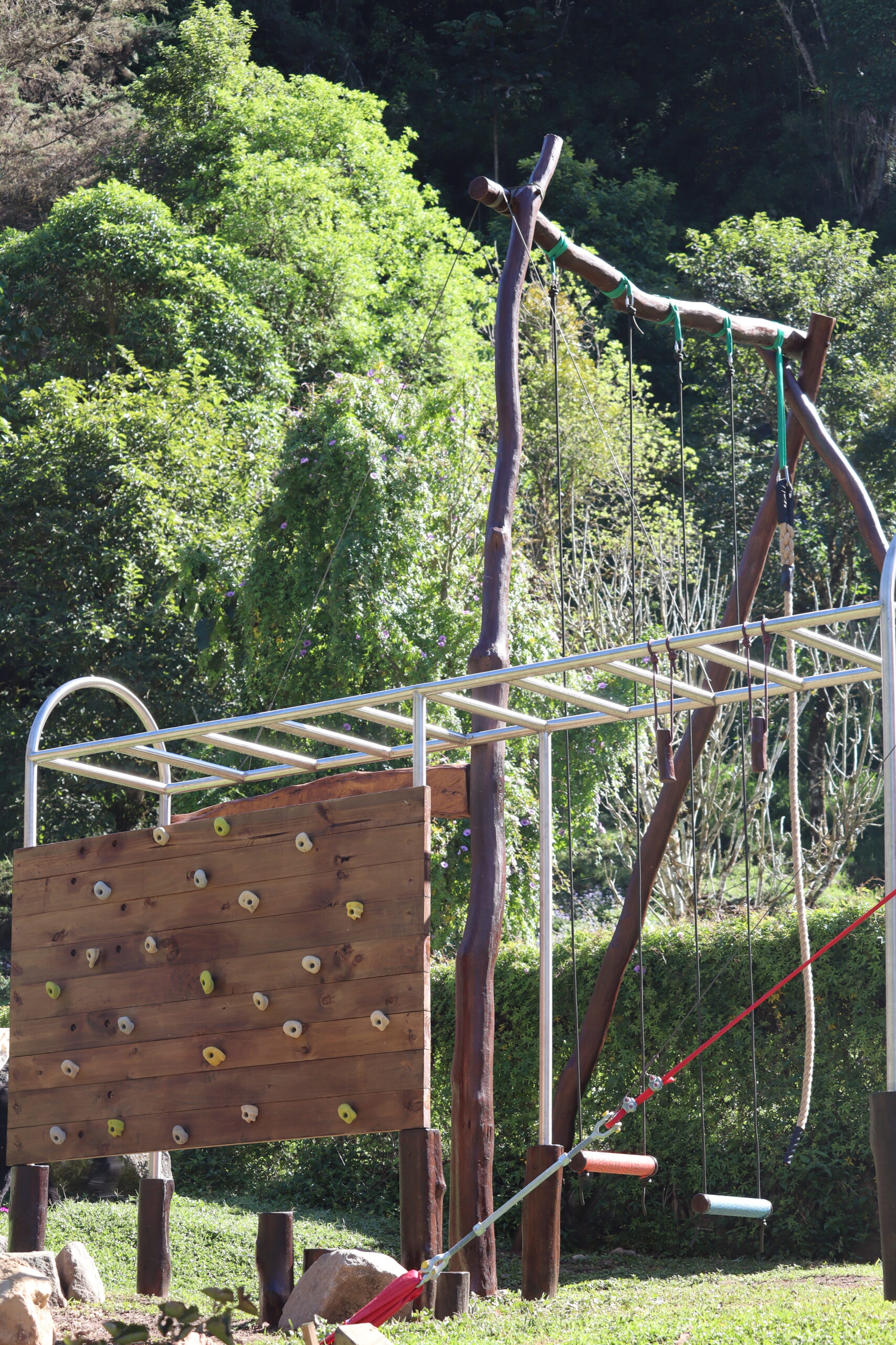 Alongside the main structure, a training area offers a more dynamic experience for older children and adults. It features a monkey bar setup with various elements, including a custom organic fingerboard and a climbing board—providing space for physical challenge and playful discovery at every age.