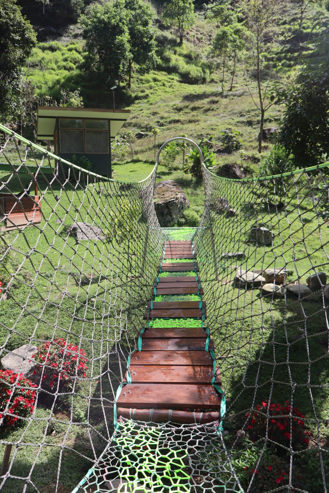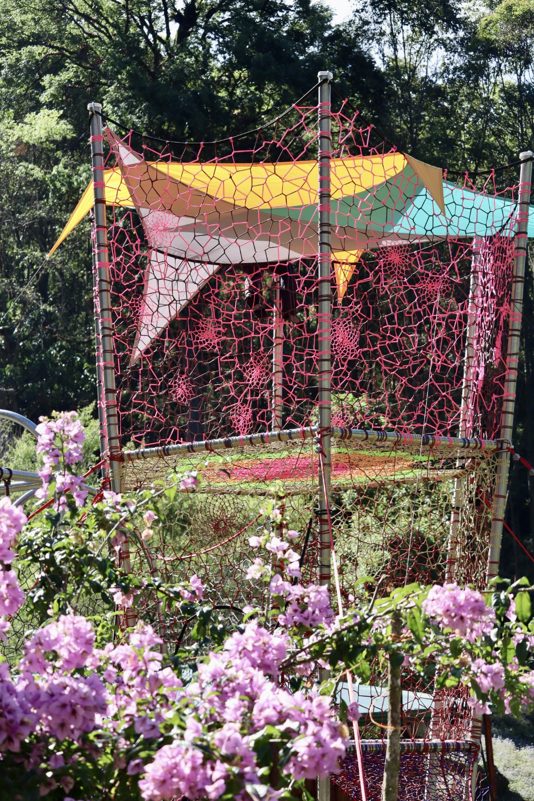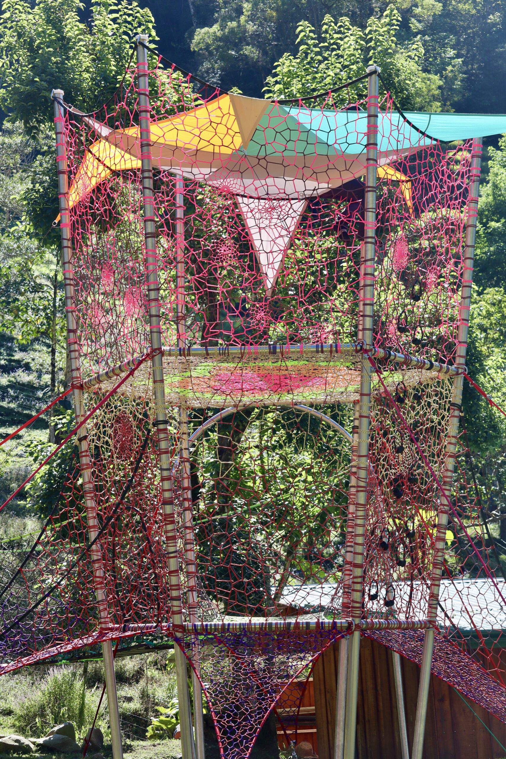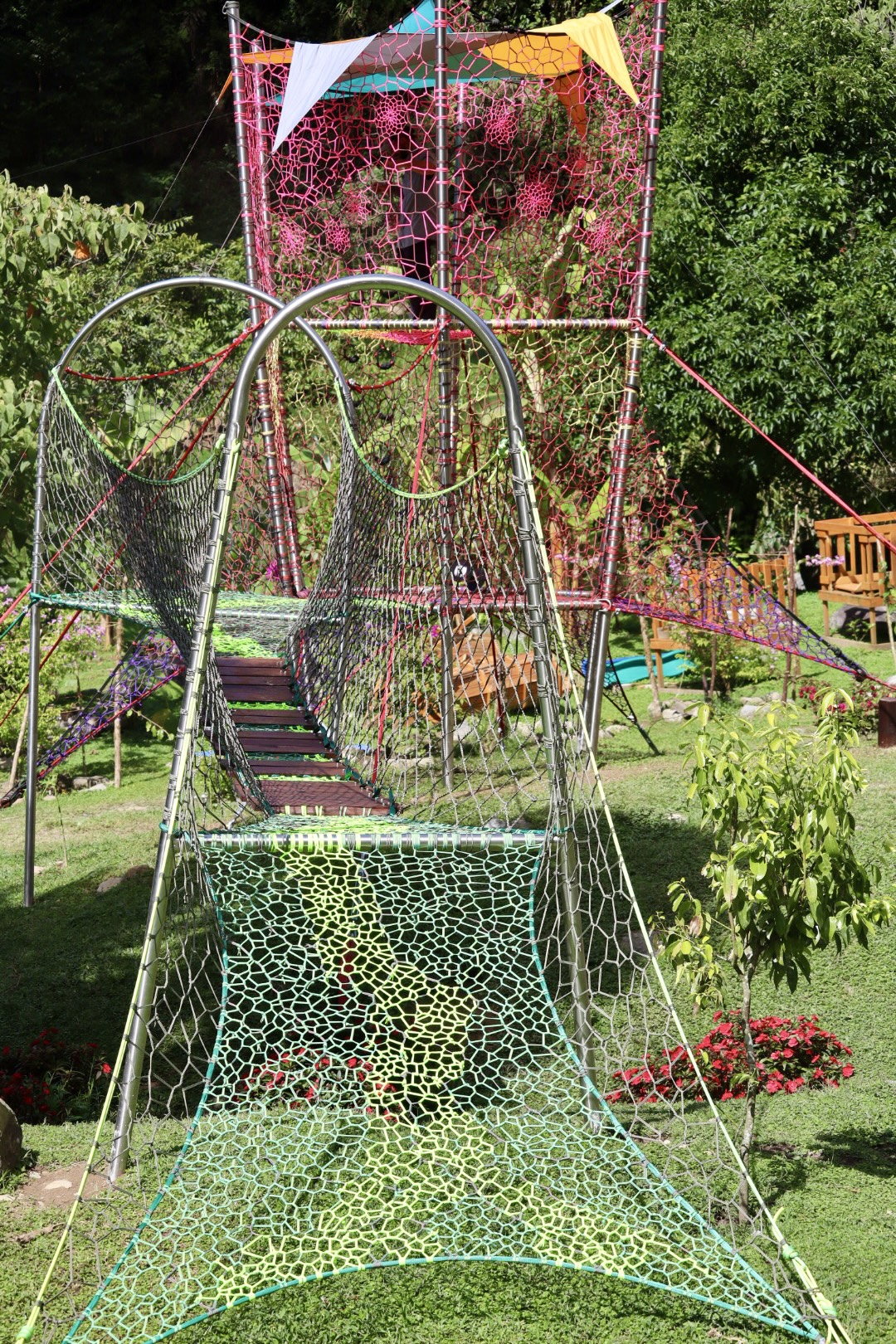 Multiple entry platforms lead into the experience, including a beautiful artistic bridge that connects to the main structure and ends in a woven ramp— used as a slide. Suspended vibrant paths and platforms at different heights. The space encourages free movement, balance, and imagination!